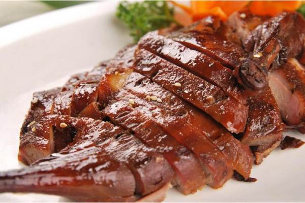 1、殺鴨退毛,去內臟,鴨腳,從胸脯剖開洗凈,再吊起滴干水份;