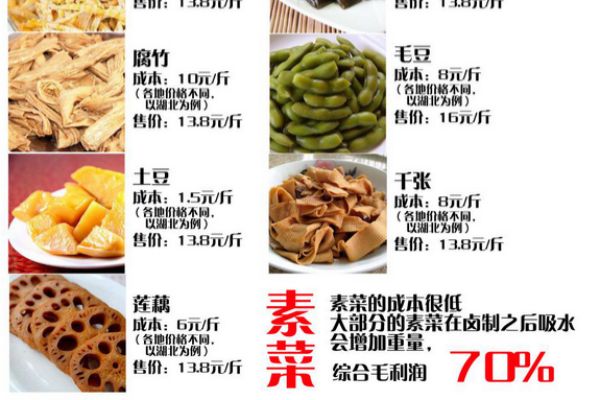 綜合毛利潤:葷素菜的毛利潤,鹵菜的毛利潤為67%左右。也就是賣100元的營業(yè)額有67元的毛利潤(不包括人工,房租,損耗等各種額外開支的利潤)