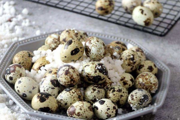 再放入鵪鶉蛋,最后把剩下來的鹽倒入盤中,把鵪鶉蛋埋在鹽中。