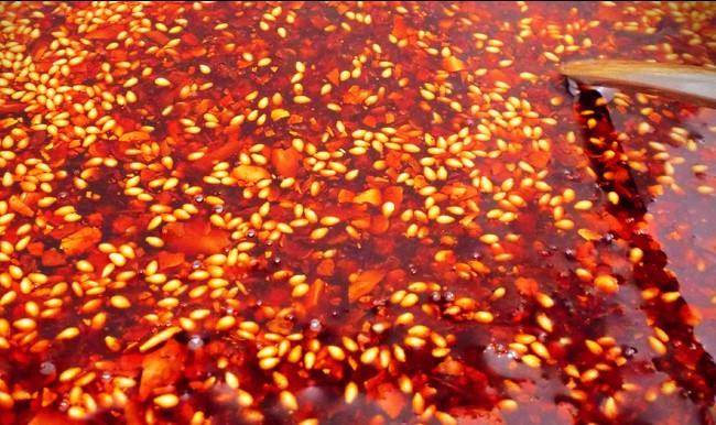 取一鍋,不妨大些,要有蓋子。放植物油,邊加熱邊把干紅辣椒大量,掰開,放入。至油大熱,辣椒微糊,撒入辣椒碎大量,花椒一把(四川漢源最好),迅速將鍋從火上移開。