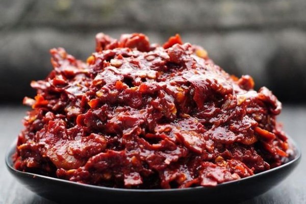 備注 自制辣椒醬 選鮮海椒5千克攪爛,加入鹽150克、白酒10克、臨江寺豆瓣500克攪勻,入有水沿的壇中,隔年使用最香。