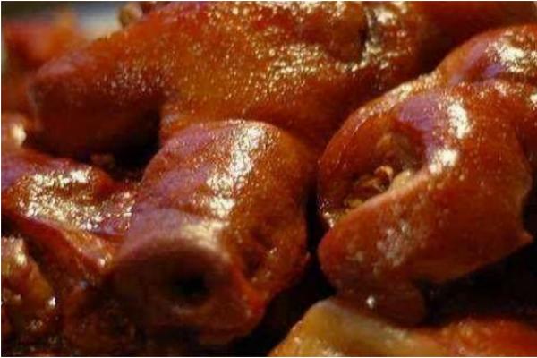 (4)鹵制:洗凈的下貨放入鹵湯鍋中,加黃酒300克、豬肉香精10克、蠔油50克、鹽250克,大火燒開,轉小火煮30-50分鐘,全部撈起檢查,可以用筷子往肉里扎一下,如果有血水流出,說明沒有完全鹵好,重新放入鹵鍋中鹵制,直到鹵好為止。將鹵好的半成品放入已涼制的鹵水中浸泡10-15分鐘后撈出即成。