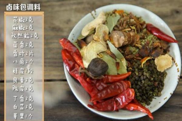 花椒 3克、麻椒 2克、孜然粒 2克、茴香 2克、香葉 兩片、八角 兩個、桂皮 一段、良姜 3克、陳皮 3克、丁香 3克、白芷 3克、草果 一個