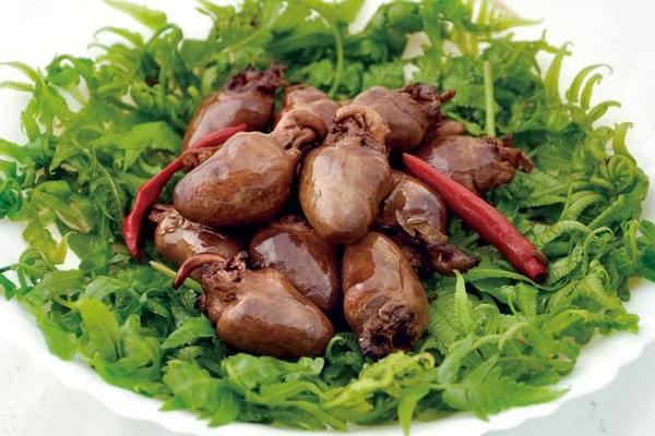 原料處理時,需要將雞肫油脂去除,撕去黃色硬皮,對半切開。雞肝要去除雞膽,雞心要劃一刀,雞腸要剪開,去除污物,用鹽、醋反復搓洗,凈水漂凈以去除腥膻味。雞腎(腰子)需要撕去筋膜。以上雞雜加工后用清水沖洗干凈待用。