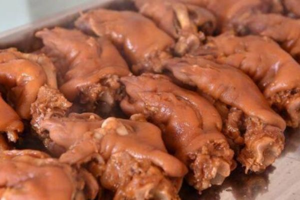 (4)鹵制:洗凈的下貨放入鹵湯鍋中,加黃酒300克、豬肉香精10克、蠔油50克、鹽250克,大火燒開(kāi),轉(zhuǎn)小火煮30-50分鐘,全部撈起檢查,可以用筷子往肉里扎一下,如果有血水流出,說(shuō)明沒(méi)有完全鹵好,重新放入鹵鍋中鹵制,直到鹵好為止。將鹵好的半成品放入已涼制的鹵水中浸泡10-15分鐘后撈出即成。