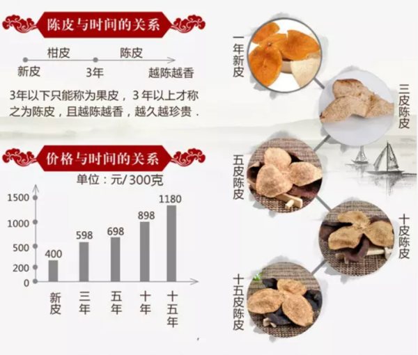 全國以廣東新會(huì)產(chǎn)的陳皮最好,俗稱"廣陳皮",廣陳皮,常常3瓣相連,形狀整齊,厚度均勻約0.1厘米,點(diǎn)狀油量較大,陳香味濃,鮮品對光照視,透明清晰,質(zhì)較柔軟,味道醇厚回甘明顯。