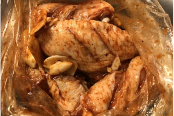 3、將雞翅和腌料放到袋子里進(jìn)行拍打和揉捏,這樣有助于腌料的充分吸收。