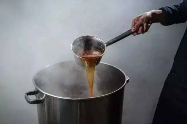 6、鹵水每次鹵完食物后必須燒開保存,如果鹵水越來越釅的時候,就必須用雞血一只雞的血加1 kg水)與水攪散倒進鹵水內攪轉起旋渦,待靜止后再燒沸騰后用紗布濾去雜質。