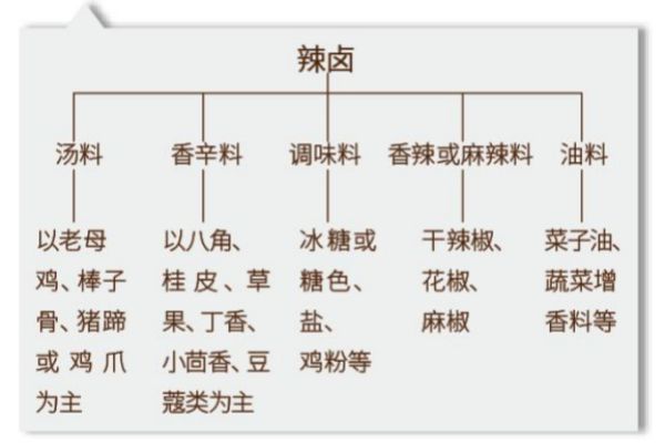 四、辣鹵中所用的高湯與五香鹵水所用高湯的熬制方法差不多,也是要用雞、鴨、豬棒子骨、雞骨架等原料加清水和姜蔥熬制,但要加入大量豬肉皮,以使鹵水有一定的稠度。