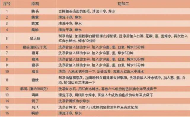 食材鹵制前需要初加工目的是去除異味和腥味,保證鹵制后的成品香味醇厚,這一步非常關鍵,下面是部分食材的初加工表: