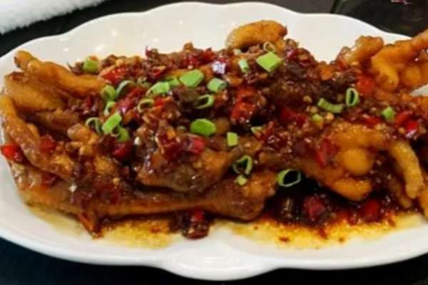③將炒鍋洗刷干凈,放置于火上,下入芝麻油50克燒至約三成熱時,放入泡椒茸40克、姜末20克、蒜末20克、蔥花20克,煸炒至油紅亮并能聞到香味時,迅速烹入調好的芡汁,燒開倒入盛雞爪的容器中拌勻,食用時裝盤即可。
