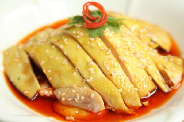 ②用開水將雞身上的油污、血沫等沖洗干凈,泡入涼開水中或冰水中,涼透后撈起瀝干水份,剁成條塊裝盤。