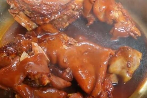 4.用瓦盆內盛精鹵水1500克,清水1500克,置于爐上,以中火燒沸,下扎蹄,轉用小火熬約30分鐘至八成熟;取出,扎小孔后放回盆內,再熬至軟爛,撈出晾涼,去竹板,換水草;換時,去一道,立即重新扎上一道,以防松散。換畢,放回已冷卻的鹵水盆內。食時取出,豎切成兩爿,然后橫切成片,每片約1厘米厚。裝盤后,以原鹵水加芝麻油拌勻,淋上即成。