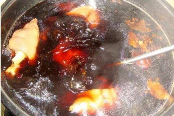 要先把八角、陳皮、香葉、小茴香、羅漢果、桂皮、白芷用水泡6分鐘,再裝到香料袋里扎緊備用。鍋里放入豬油和食用油燒熱,再放入冰糖炒出糖色后,加入干辣椒、生姜炒香,再把提前準(zhǔn)備的筒子骨湯倒進(jìn)去,這時(shí)可以把香料包以及料酒、生抽、老抽、蔥倒入鍋里,先煮10分鐘,再放入豬蹄,大火煮半個(gè)小時(shí),再調(diào)到小火繼續(xù)煮2個(gè)小時(shí),等到豬蹄軟爛時(shí),再放適量的鹽和雞精稍微煮幾分鐘,鹵豬蹄就做好了。