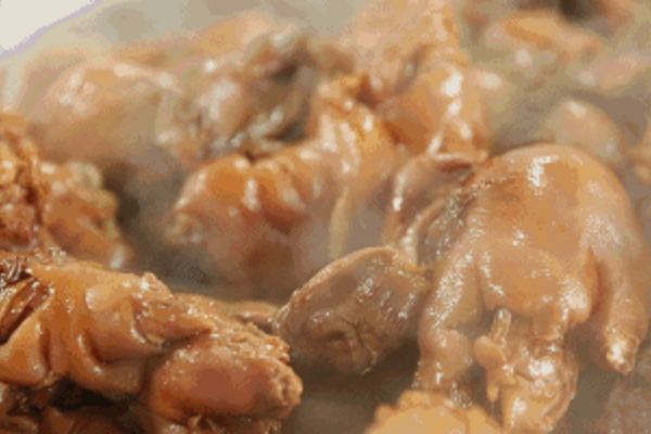 第四、腌制:用鹽水加料酒加姜片等腌制三個小時以上,再撈出來控干水份,接著用噴槍燒毛,丟進水池浸泡,然后洗刷干凈。