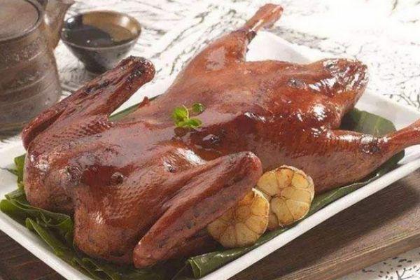 4、將浸炸后的鴨子放入調好的鹵水湯料中小火鹵50分鐘撈出,用荷葉包裹入蒸籠里大火蒸3分鐘,取出入蔥段、紅椒圈、香芹、蘭花裝飾即可。