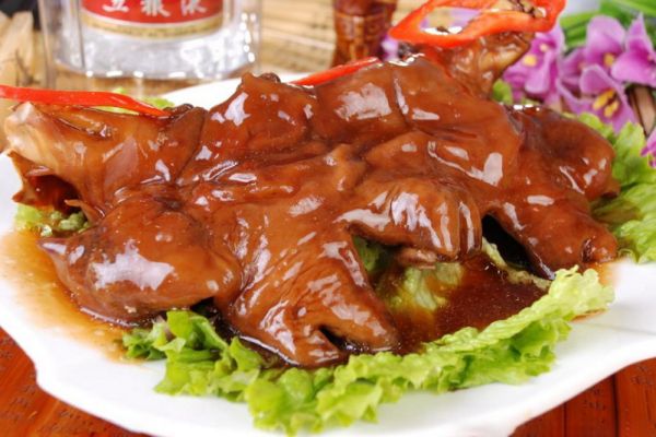 3、將炒鍋中的湯汁取出,打芡澆在羊臉上即為麻辣口味紅扒羊臉。