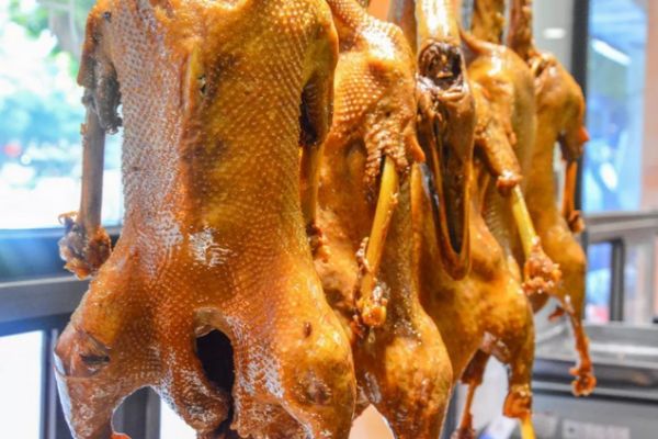 2、將大蒜、芫荽頭、南姜放入光鵝腹內(nèi)(鹵熟時(shí)取掉),再把鵝放入鹵水盆里,大約煮1小時(shí)30分鐘(中間要將鹵鵝吊起離湯后再放下,反復(fù)四次)并注意把鵝身翻轉(zhuǎn)數(shù)次,使其入味,然后撈起放晾待用;把熟鹵鵝放在砧板上切成厚片,淋上鹵汁,使之濕潤(rùn)即成;上席時(shí)跟上蒜頭醋2碟。