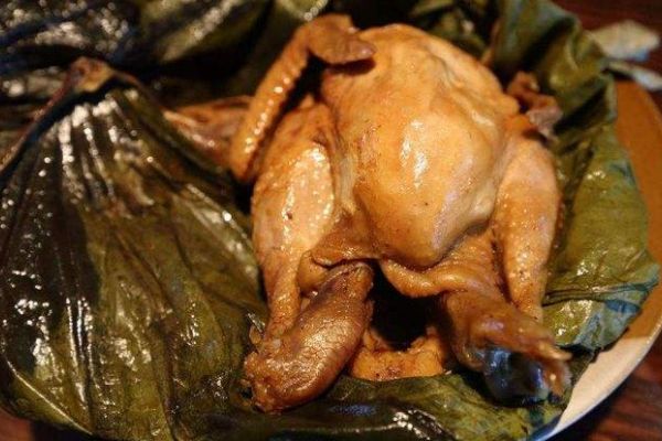 將鹵水燒開,底部墊一個篦子,放入冰糖30克、蔥段50克、姜片20克,紹酒150克,然后放入盤好造型的雞,在用一個篦子壓住,燒開后,一直用小火鹵1.5小時關火,撈出,然后用泡軟的荷葉將鹵雞逐只包裹,用草繩或者棉線捆綁好厚,在放入熱鹵水中浸泡10分鐘,撈出放涼后即可出售或者食用。