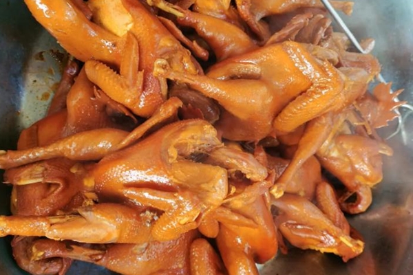 ③炒鍋置中火上,加色拉油,豬化油,油溫升至五六成熱,下蔥節(jié)、姜片洋蔥塊、蒜瓣炒香,人鹵水桶中,投入香料袋,老姜、大蔥,摻人鮮湯,加冰糖料酒、胡椒粉、精鹽燒沸,小火熬至香氣四溢,下雞、雞精、味精,中火燒沸,撇凈浮沫,改用小火鹵至竹筷能從雞腿中截穿時(shí),鹵水桶移離火口,待鹵雞在鹵水中浸泡20分鐘后撈出,瀝凈鹵水,五香浸雞即已制成。
