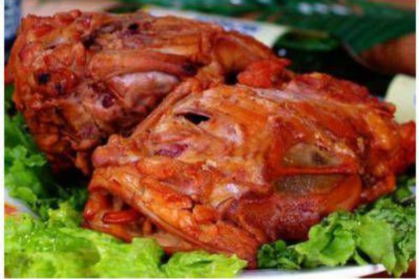 3.醬制:腌好的肉坯瀝干鹵水。 鍋內(nèi)先燒開水,再投入香料、輔料,然后將肉坯下鍋,旺火煮制,加入紹酒、醬油后,再改小火燜 2 小時(shí),待皮色呈麥稈黃色時(shí),在出鍋前 30 分鐘加入糖。 出鍋時(shí)逐塊擺在盤里,皮朝上,趁熱將肋骨拔出,保持形狀美觀,冷卻后即為成品。