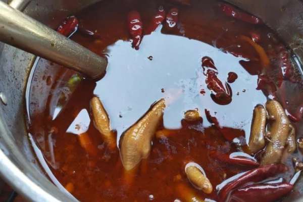 鍋里放色拉油燒熱,投入老姜片、大蔥節(jié)、洋蔥絲、八角、山柰、桂皮和白芷,待炒至大蔥微黃時,才下辣椒面炒香炒出色,隨后往鍋里摻入鮮湯和川式老鹵水,燒沸以后加入干辣椒節(jié)、干花椒、大青尖椒、青小米辣和紅小米辣,熬約20分鐘后,再調(diào)入鹽、味精、雞精、胡椒面、生抽、白糖和香油,便制成了辣鹵水。