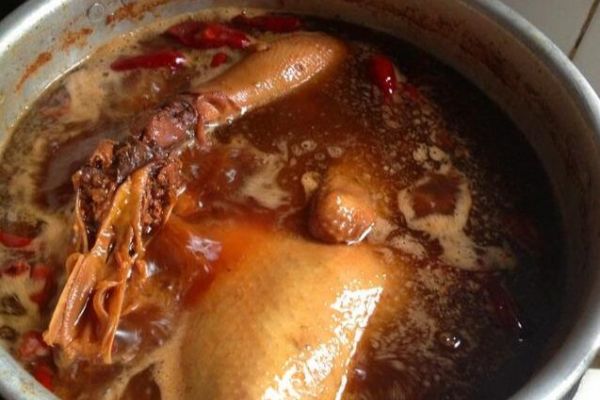 以8斤為例。將所需要鹵制的食材,經(jīng)過完全清洗,焯一水之后,直接放入到鹵水中去鹵,全程開小火,食材在小火鹵制的過程中味道和顏色是逐漸進入的,所以先調(diào)入少量30毫升中壩醬油進去上色,隔15到20分鐘以后再去觀察是否還需要增加顏色。整個過程小火悶鹵即成。