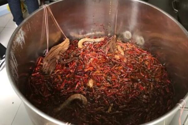 2、稱量水、花椒、辣椒、生姜、大蔥、油小火熬30分鐘。在小火熬制的同時可以按照配方稱取其他輔料(老鹵膏除外)。