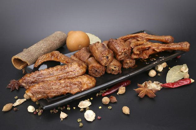 鹵制:取上面制作好的老湯,加入中藥包、干辣椒80克、花椒30-60克(根據當地口味增減)、大廚四寶肉寶王6克、鴨肉香精10克、乙基麥芽酚4克、鹽150克、味精100克、雞精50克,大火煮開后10分鐘下入胭脂紅0.5克(根據顏色深淺調整用量)、異VC鈉3克,下入鴨脖大火煮開,煮約20分鐘停火燜泡5分鐘撈起,鹵制完成。鹵湯用過一次后,湯量會減少一部分,在下次鹵制前,要先添清水使鹵湯達到規定刻度,然后再根據鹵制原料的多少重新投料調味。中藥包內的藥材在熬制鹵水時香味會揮發一部分,所以在鹵制原料時還要加一次藥包及辣椒、花椒等,以補足揮發掉的香氣。