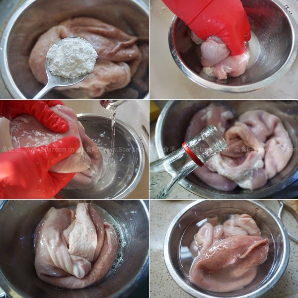 1,豬肚用水沖洗掉明顯污漬和黏液后,翻到反面,加一半小蘇打;