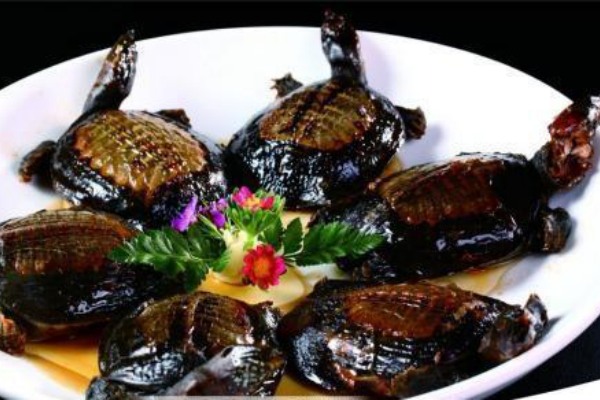 1、小甲魚(每只重約125克)10只宰殺,從龜背下方開一個5厘米左右的小口,除去內臟,沖凈血水,然后放入開水中汆燙一下,撕去表面的粘膜。