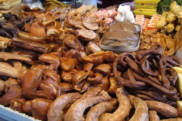 做法:將川椒100克、八角150克、桂皮100克、丁香50克、紅曲米50克、甘草50克、裝入“藥袋”;肥肉500克切片,炸出豬油后棄渣。取大不銹鋼鍋,倒入清水12.5千克,老抽1500克,生抽1500克,魚露500克,冰糖150克,精鹽500克,用旺火燒開后,放入豬油,南姜250克,青蒜250克,炸蒜頭150克,芫荽250克,紹酒250克,“藥袋”煮開20分鐘,便成鹵水。鹵水存放時間愈長愈香。