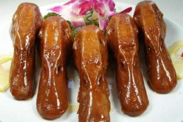 4、鴨頭上糖色,先用油把糖燒成金黃色(小火融化糖),把鴨頭放入鍋內上色,上完色的鴨頭基本就是這樣,把鍋里剩余的糖汁倒掉,如果喜歡甜點么,可以不用倒掉。