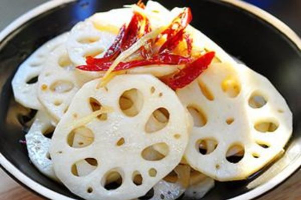 原料:鮮藕250克、干紅椒5顆、姜絲10克、香麻油1大匙、沙拉油1大匙、香醋2大匙、砂糖1大匙、細鹽1/2小匙
