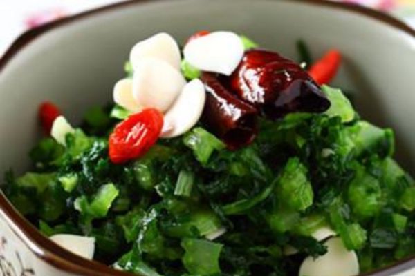 原料:芹菜葉400克、北杏仁、鹽、醋、蒜3瓣、干辣椒、香油、油