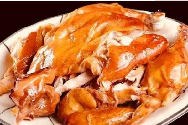 處理好雞放入鹵水,先用在大火將鹵水燒開,然后再用文火鹵煮1小時(shí)左右,直至雞肉酥爛。撈出時(shí)要?jiǎng)幼饕p,注意保持造型美觀。
