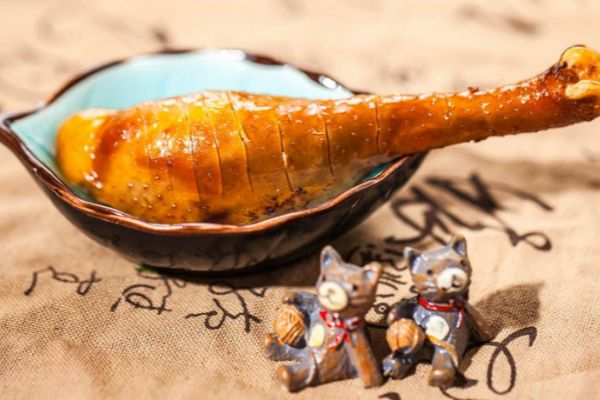 3、在鹵水開鍋狀態(tài)下放入雞腿或者雞翅根,再加入紹興黃酒250克,開鍋后保持小火狀態(tài)鹵45-50分鐘,撈出即為成品,冰糖雞腿可直接食用,也可以食用,也可以進行下一步操作。
