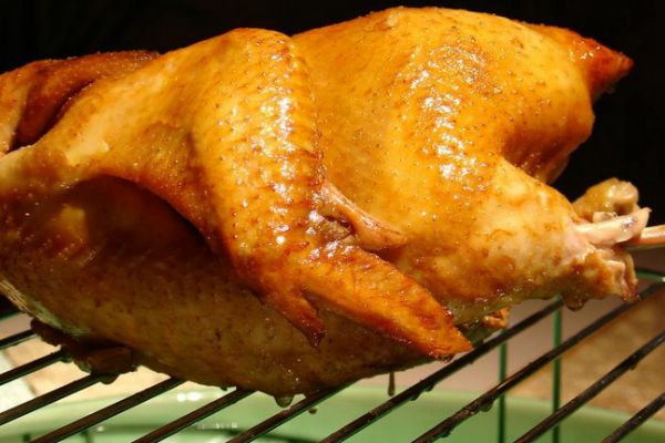 8、出爐:出爐后趁熱在雞皮表面涂上一層香油,使皮更加紅艷發亮,擦好香油后即為成品烤雞。