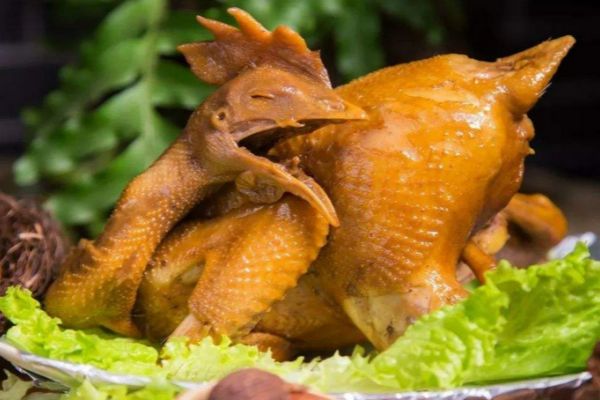 (4)將菜籽油50克、蔥段25克、姜片25克、放入炒鍋中炒出香味,倒入清雞湯,放入香料袋,燒開后倒入準備好的砂鍋中(墊入一個竹篦子),再加入雞、紹酒、精鹽,雞身上壓一個瓷盤,加砂鍋蓋,用中火燒開,改微火慢煨,約80分鐘左右,待雞熟,取出晾涼,斬切成塊裝入盤中,澆上砂鍋中的雞湯上的油和醬油即可食用。