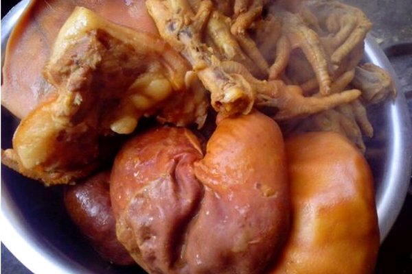 做法:1)洗凈豬蹄,用開(kāi)水煮到皮發(fā)脹,然后取出用指鉗將毛拔除,后斬成小塊。